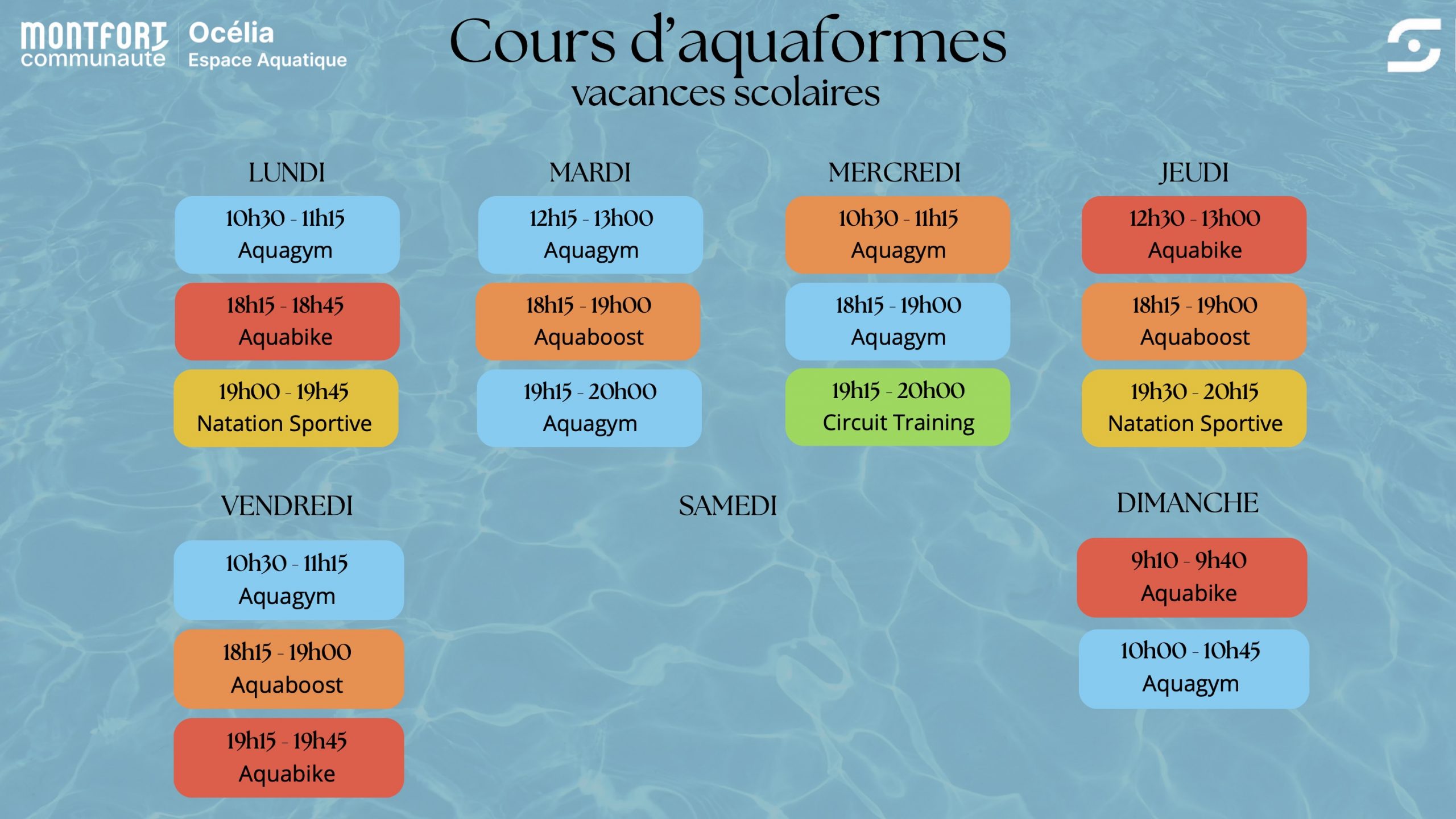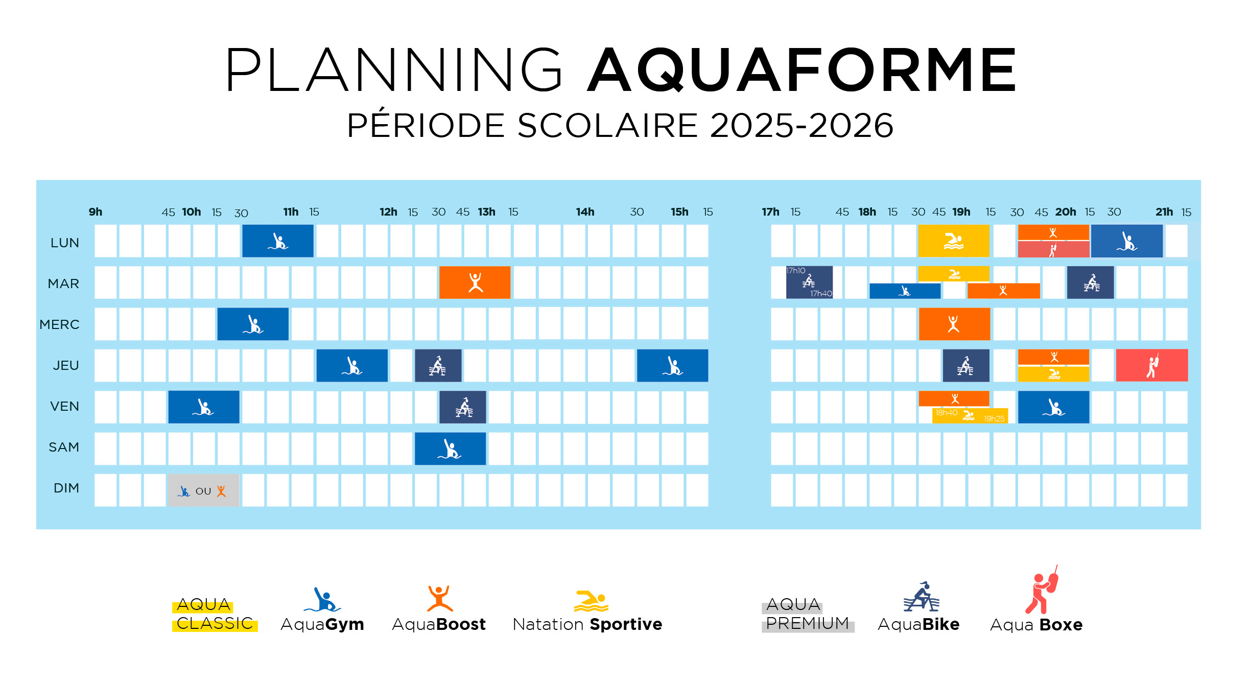 PLANNING ACTIVITÉS ACTIVITÉS COURS AQUAFORME AQUAGYM AQUA BOOST NATATION SPORTIVE AQUABIKE CIRCUIT TRAINING AQUABOXE COURS NATATOIRE ENFANT & ADULTE APPRENTISSAGE PERFECTIONNEMENT AQUAPHOBIE BB & Cie AQUASAFE ACADÉMIE DES KIDS CAP ROUGE CAP BLANC CAP BLEU